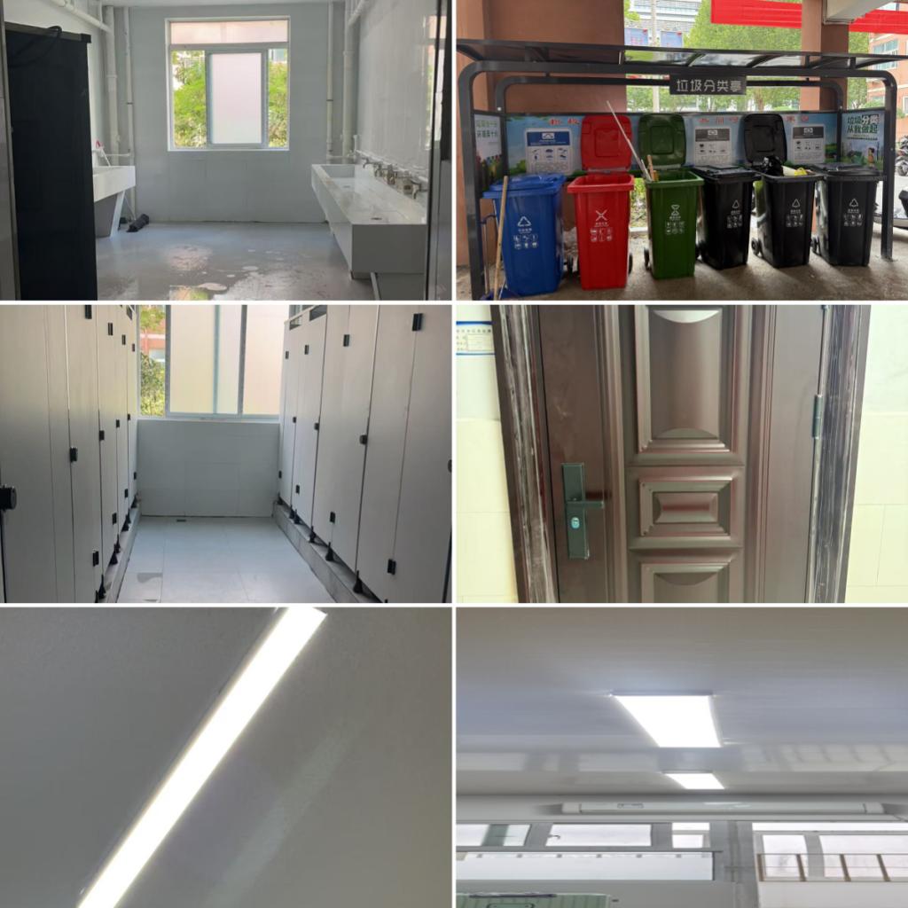 宿舍是学生在校的“家”。暑假期间,后勤团队对七楼吊顶进行加固、建立垃圾分类回收站、对宿舍楼水房与卫生间进行全面整修:疏通下水、更换管件、修补破损墙地砖,同步粉刷墙面、拆除学生宿舍老旧开裂、潮霉变形的桌柜,进行集中更换统一换新、更换宿舍照明灯、房间门与门锁,同时配套升级防盗锁芯,实现“一钥一门”精准管理,住宿环境得到整体提升。
