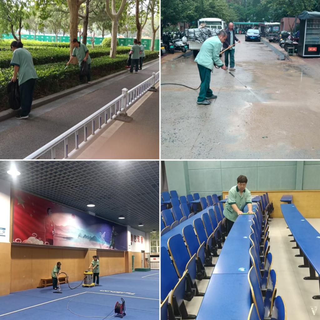 保洁团队对校园道路、绿化带、教室、场馆、宿舍等进行了深度清洁,从上到下的冲刷清洗,从里到外的桌椅清洁,不放过任何一个卫生死角。